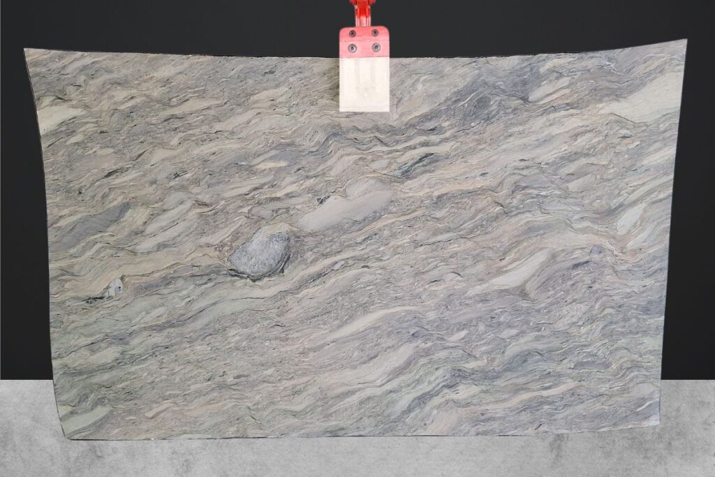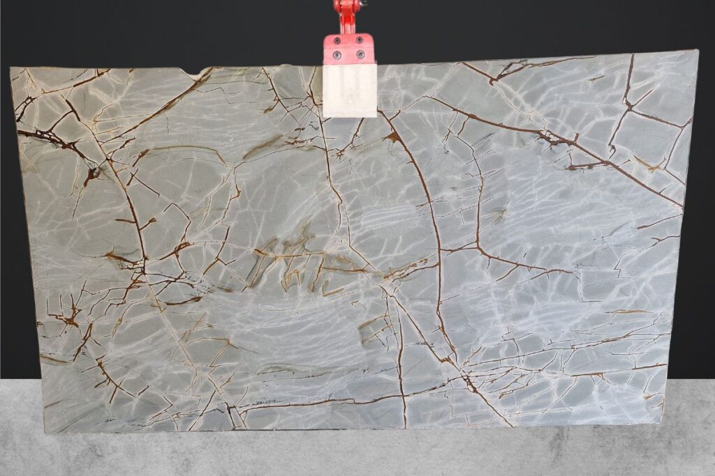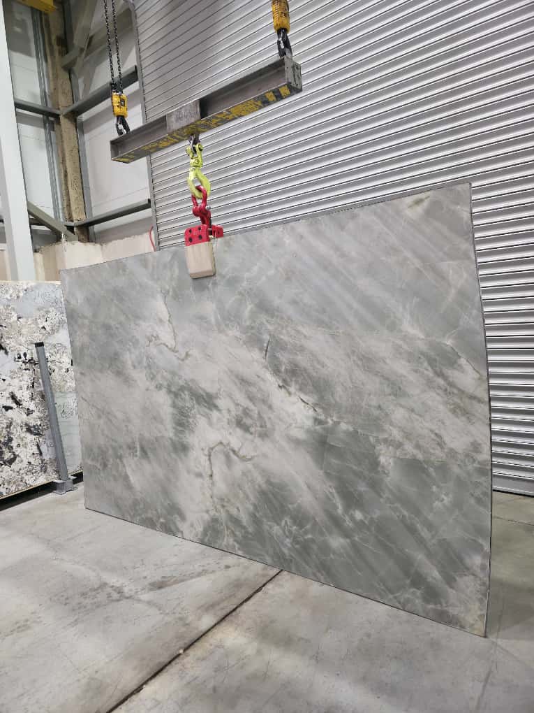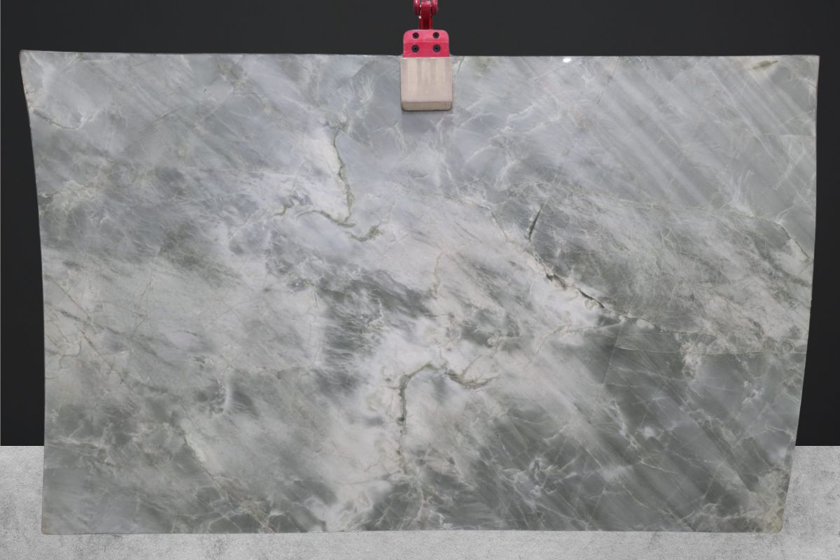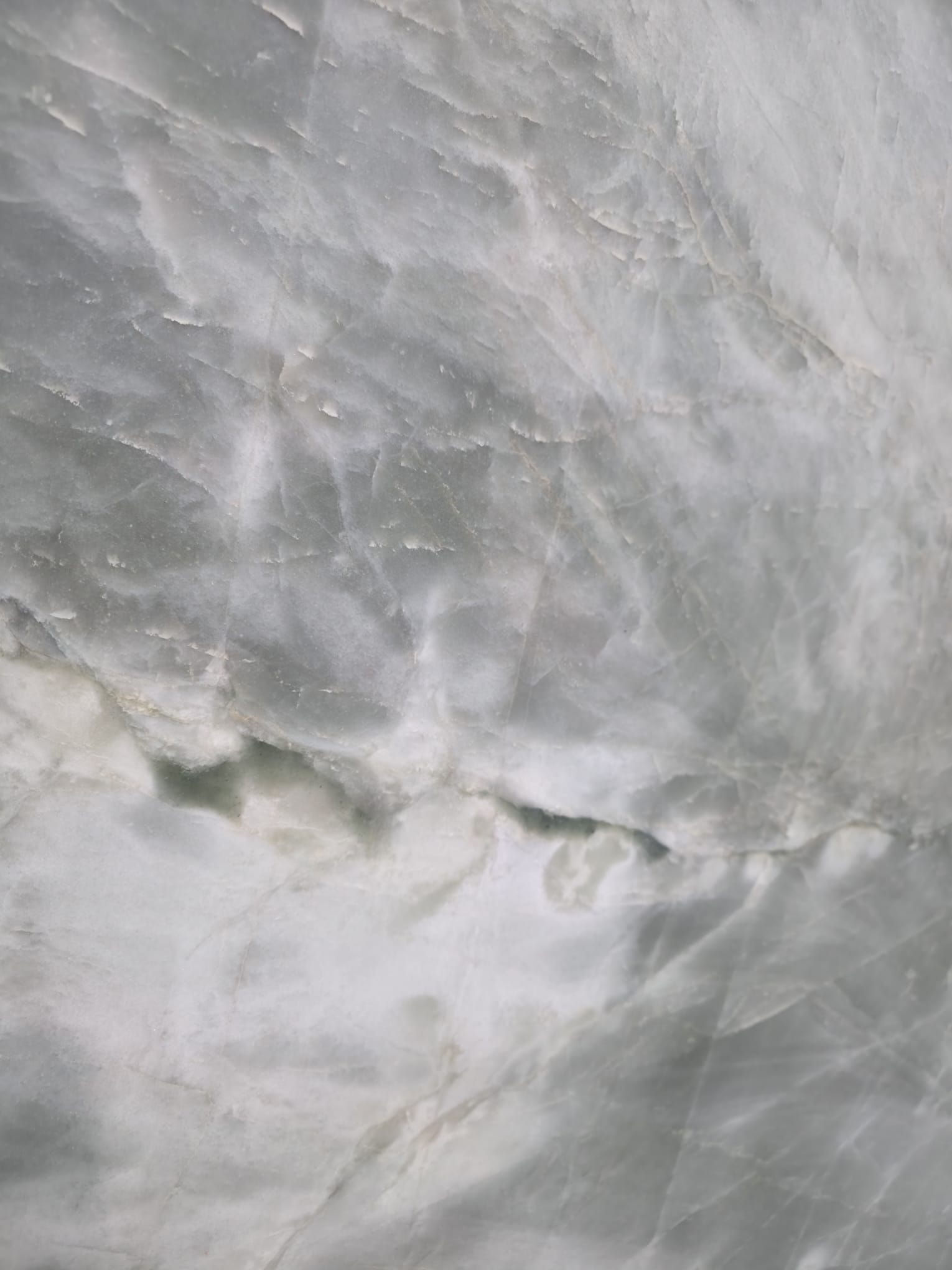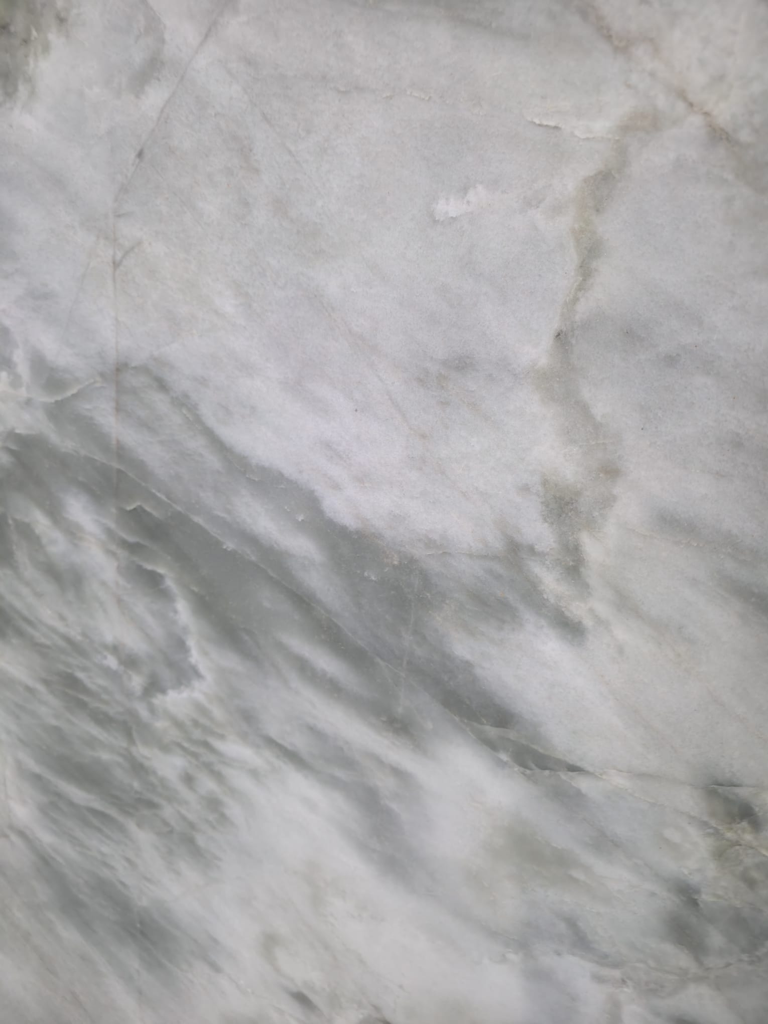 קוורציט עמיד וקשיח במיוחד, גוונים רכים של ירוק אפור ולבן, מרקם קריסטלי בעל עומק חזותימקורו בברזיל.