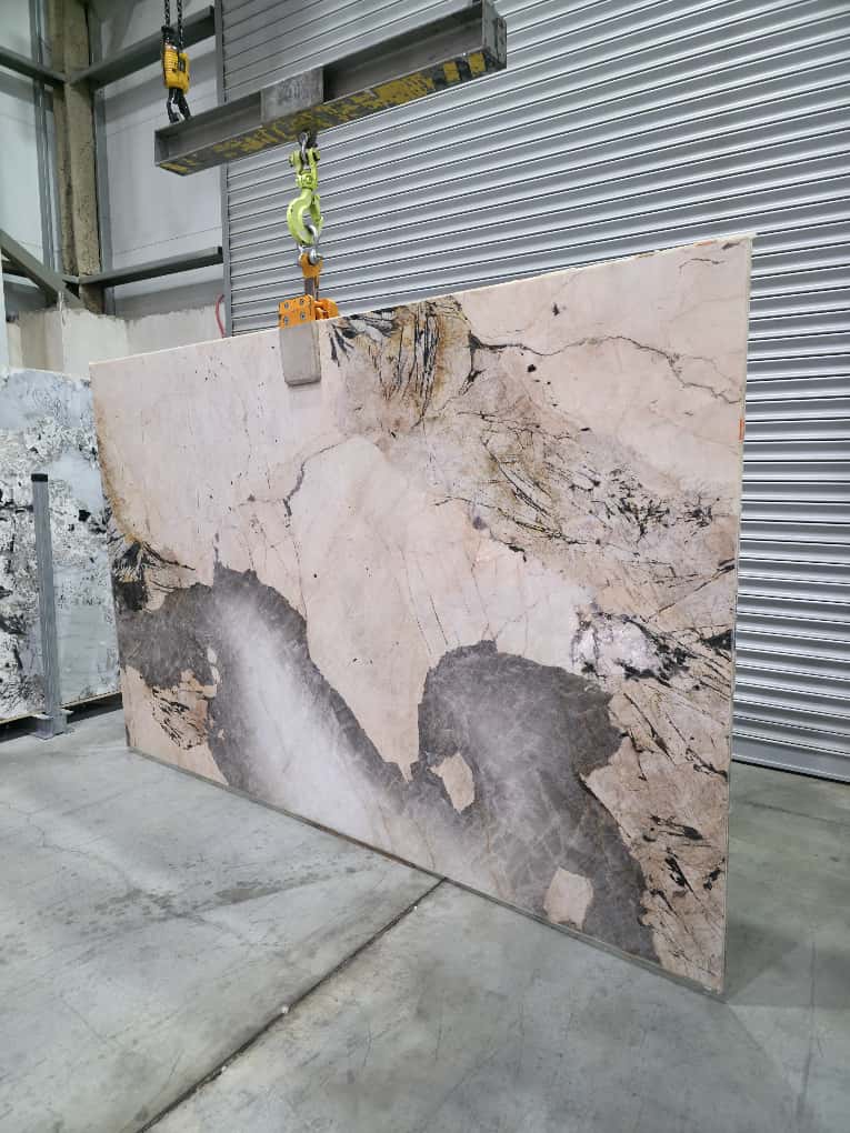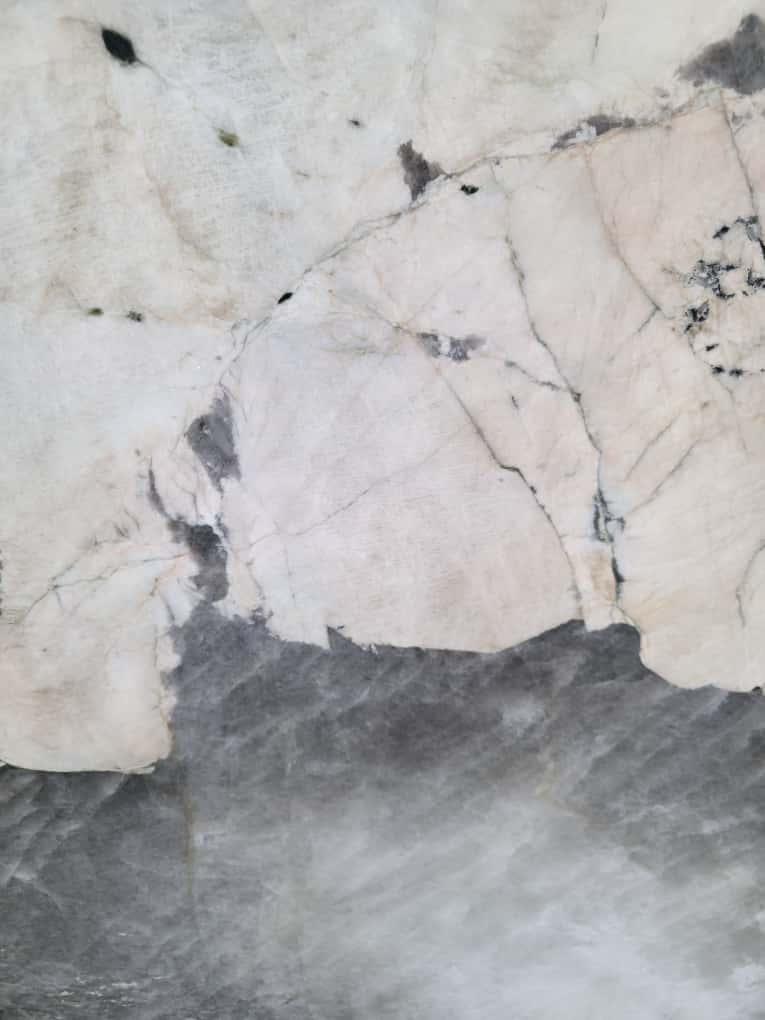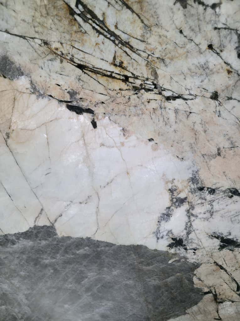 פטגוניה לבנה Patagonia White קוורציט יוצא דופן בעל רקע בהיר לבן שמנת עם מקטעים דרמטיים בגוון חום־אפור כהה, המרקם הייחודי יוצר ניגודיות עזה בין חלקים אטומים לאזורים חצי־שקופים. החומר משדר עוצמה טבעית וגיאומטריה פראית, עם נראות ייחודית שקשה להתעלם ממנה.
