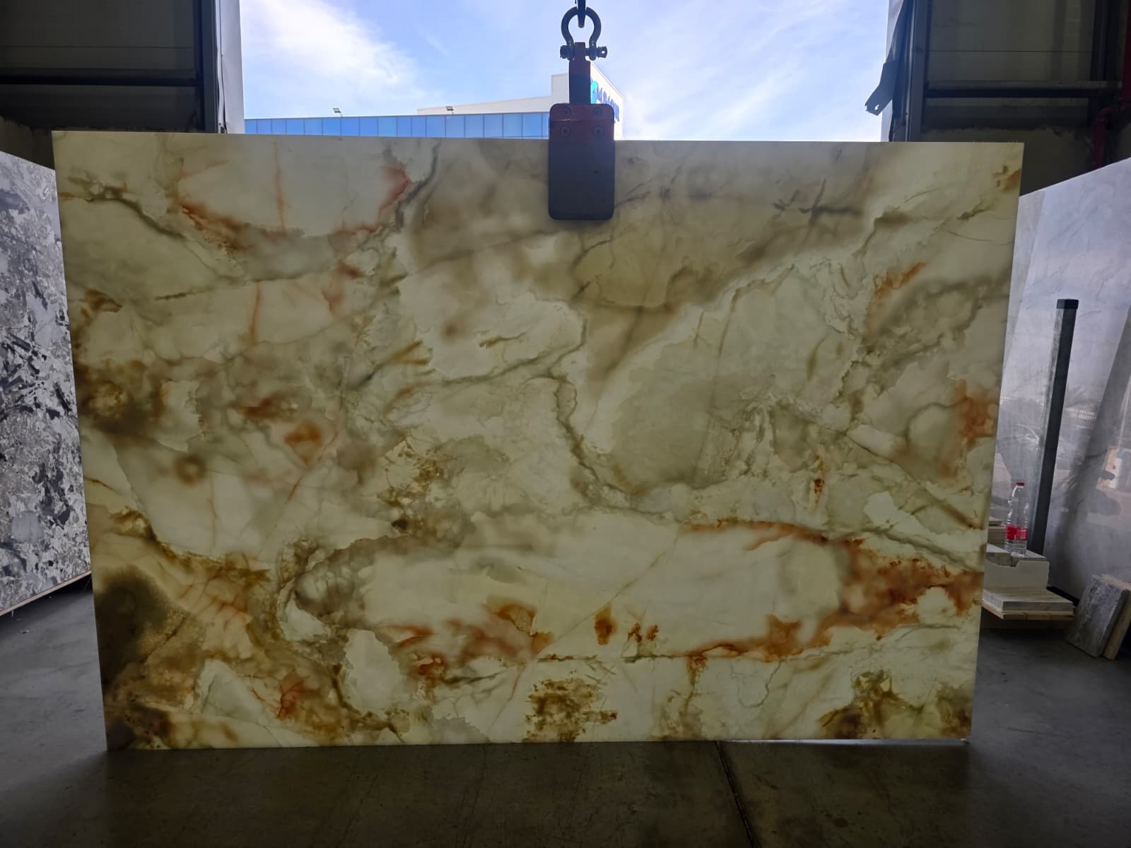 אוניקס גרין Onyx Green אוניקס יוקרתי שמרקמו הדמוי ענן יוצר תחושת רכות ואור המשתנים בהתאם לזווית הצפייה ולתאורה האבן משלבת גוונים של ירוק מרווה, לבן חלבי ונגיעות זהובות חמות המעניקים לה מראה כמעט אתרי ומתוחכם השכבתיות השקופה הייחודית לאוניקס יוצרת עומק ויוקרה שאין שני להם.