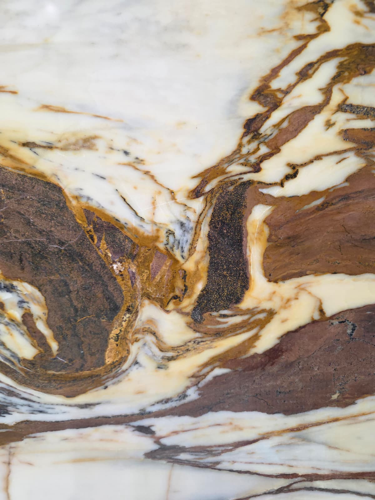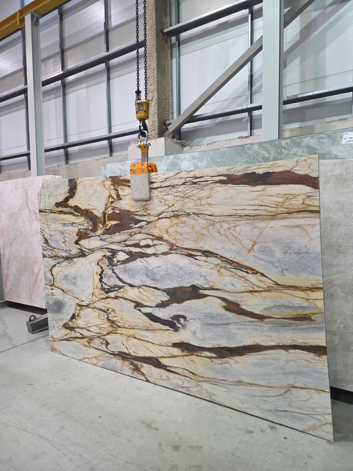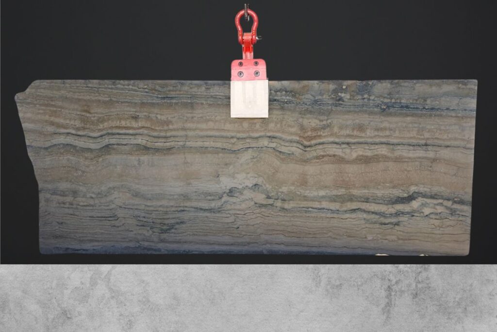 סלבדור דאלי Salvador Dali שיש דרמטי ויוקרתי בגוון בסיס לבן תכלת עם ורידים סוערים בגווני זהב נחושת, חום ואפור. הדוגמה נועזת וחזקה עם ניגודים חדים שמייצרים תחושת תנועה ועומק כל לוח נראה כמו יצירת אמנות עם טקסטורה אורגנית אך מדויקת.